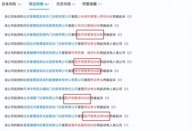 也許在營收之外,張黎剛更應關注經營合規。天眼查顯示,截至2025年7月,愛康國賓在北京、上海、廣州等地的全國多地的多個分支機構目前處於被吊銷或註銷狀態。而在其直接對外投資的120餘家公司中,周邊風險信息顯示多家公司曾因醫療糾紛、合同違約被起訴。
