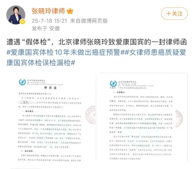近日,一篇題為《女律師十年體檢未有“患癌風險”預警,確診已是腎癌晚期》的文章引發關注。北京執業律師張曉玲連續10年在愛康國賓體檢,從未檢查出患癌風險,卻在2024年被確診為“透明細胞型腎細胞癌”。這位律師認為,愛康國賓存在漏檢、誤檢問題,並質疑愛康國賓的體檢是“假體檢”。
