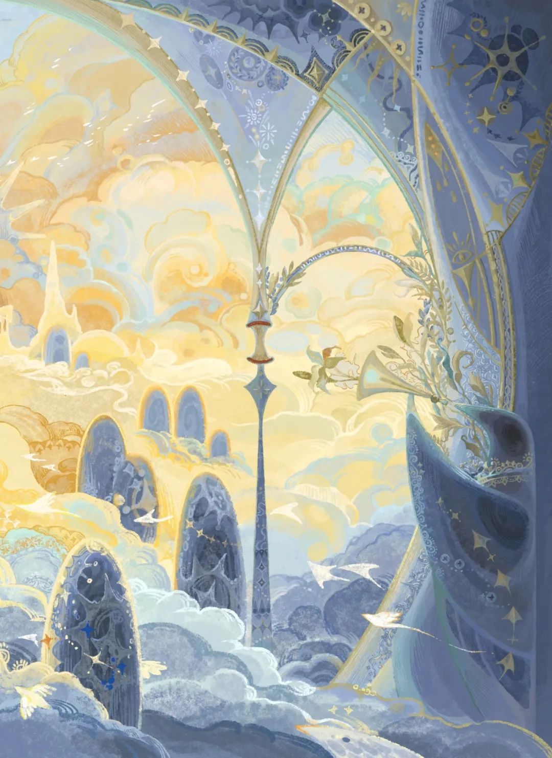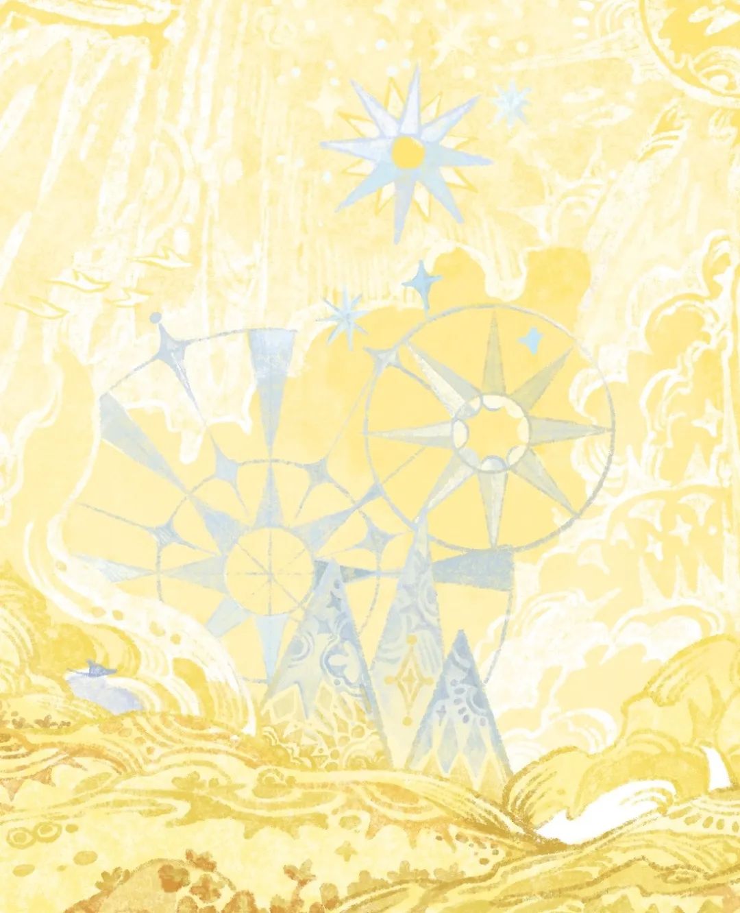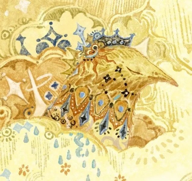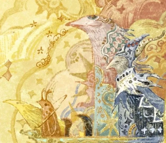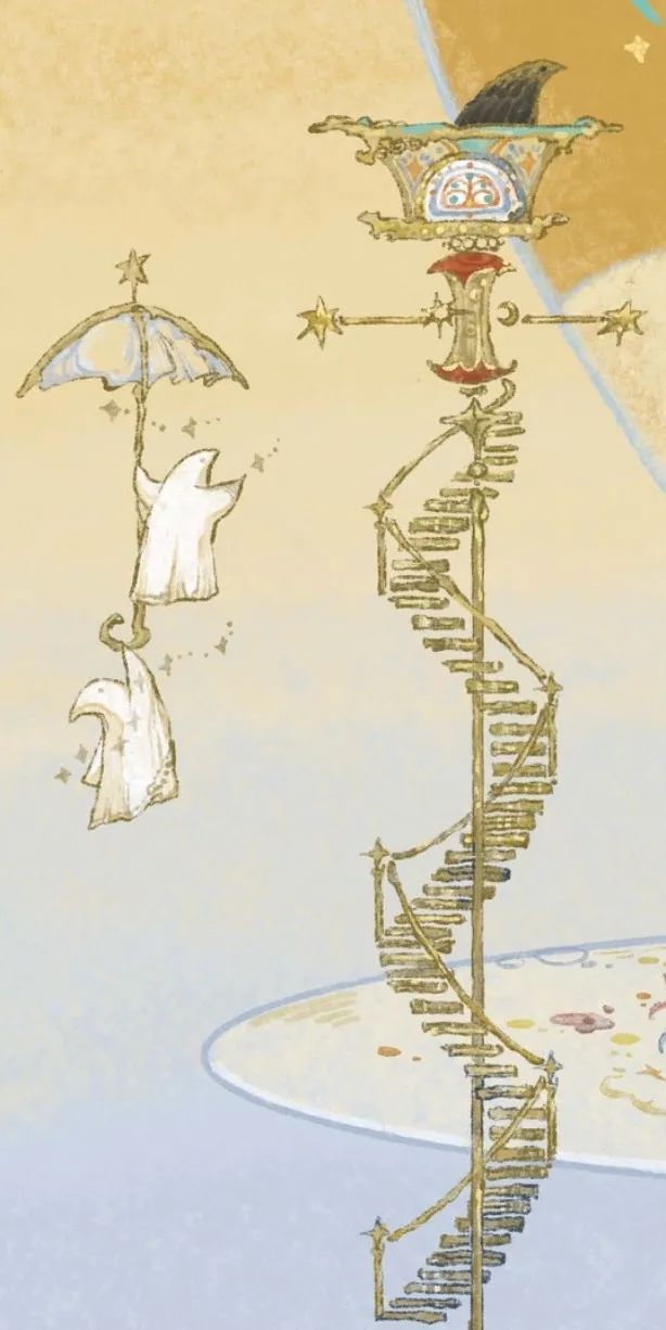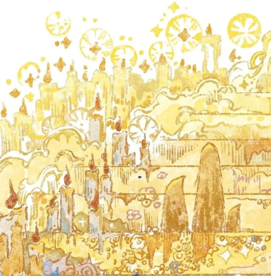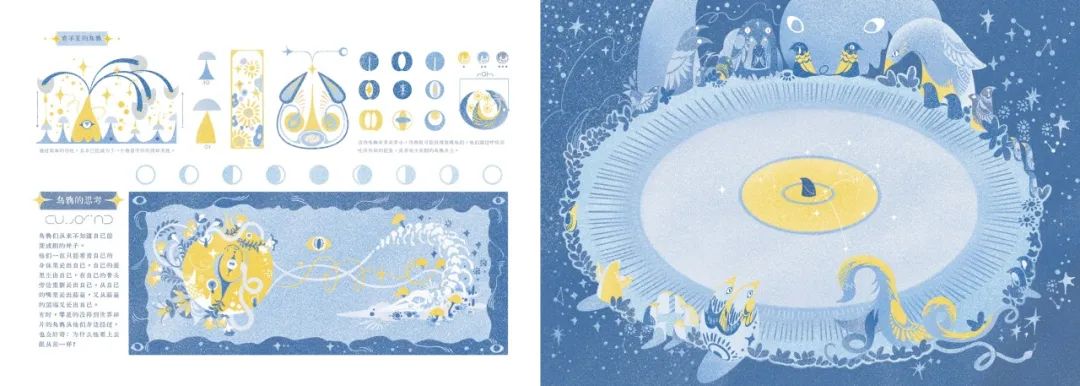 這一章是整部繪本中視覺效果最複雜也最濃墨重彩的一章,此次CIAC的參賽作品正是其中視覺語言最豐富的幾幅:黃藍主調大肆鋪陳,黃與藍、粉與藍、黃與黑碰撞對比卻又過渡自然,讓畫面在沉靜與張揚間保持着奇異的平衡。