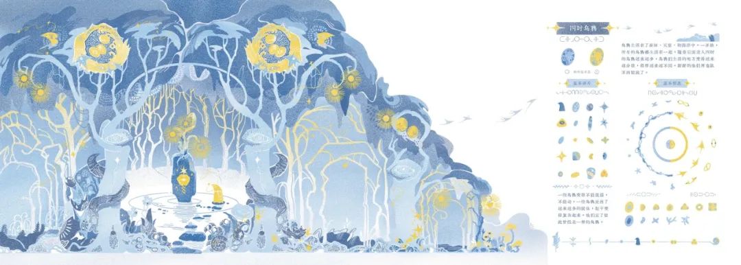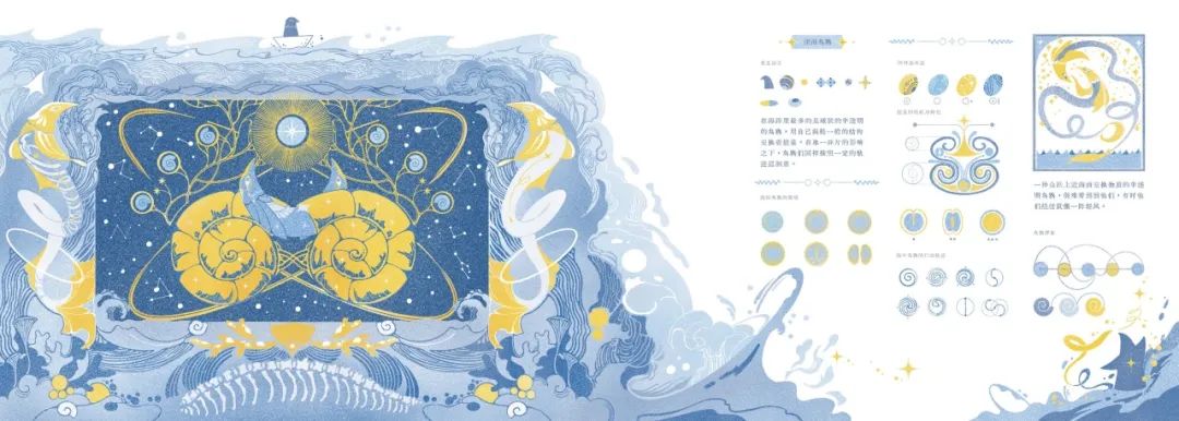 在這次的創作中想融入更多的內容和感受,所以放棄了複雜的裝幀形式,從視覺符號入手,根據文字邏輯創作合適的代表元素,再利用類似程序圖或者圖騰、圖表等形式,將帶有隱喻的元素組合分佈,試圖表達出他們的運行規則和內在關聯。