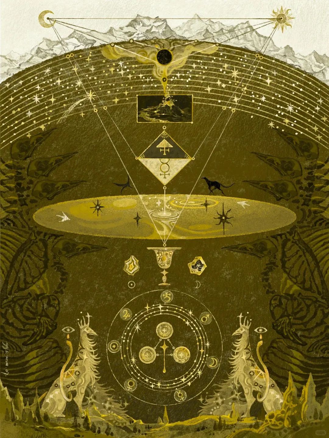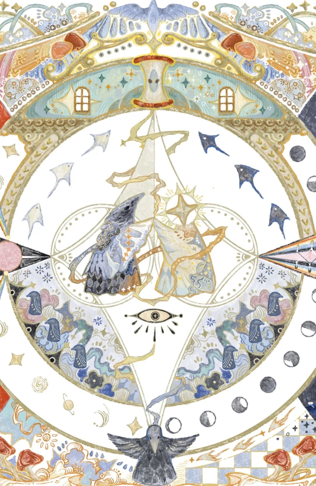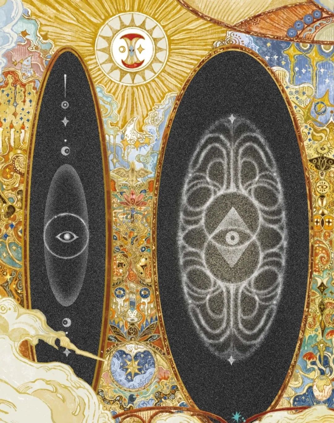 對稱式的佈局賦予了畫面儀式感,半圓形的結構強化了空間順序和神秘性,橢圓元素的重複運用,更形成一種向內凝聚的視覺節奏,既象徵循環,又通過精密的編排,讓繁複的細節統一在整體韻律中。