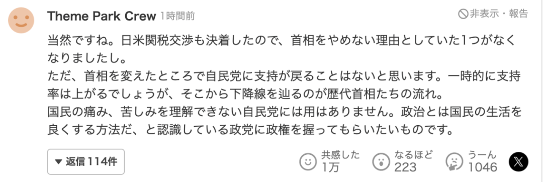 “日媒關税談判結束,石破茂就沒有理由不下台了。不過就算換了首相,自民黨的支持率也不會回來的。就算支持率會暫時上升,但隨後也會逐漸滑落。這就是歷代日本首相的命。自民黨無法理解民眾痛苦、理解民眾不易,註定其衰亡。希望日本各大政黨都能意識到,政治應是改善民眾生活的方法。”