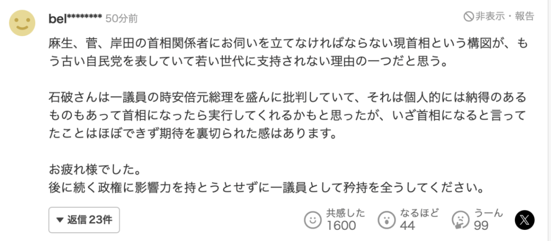 “就算要辭任,也要必須先拜訪詢問麻生太郎、菅義偉、岸田文雄等人的意見,這就是自民黨停滯不前的象徵。年輕人一代是完全不會再接受這套形式主義的。當年石破茂在擔任議員的時候曾猛烈抨擊首相安倍晉三。他當時上任首相時,向民眾許諾不少,但成為首相後,幾乎沒有實現過任何一個承諾。民眾自然會感到被辜負了。説實話還是辛苦石破茂了,請他不要試圖對後續政權產生影響,以後就以議員的身份低調行事。”