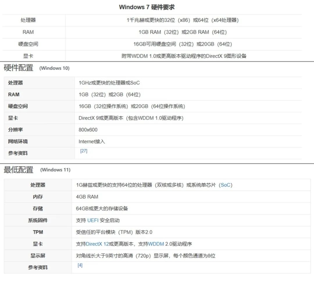 上 Win 7 硬件要求,中 Win 10 配置要求,下 Win 11 配置要求