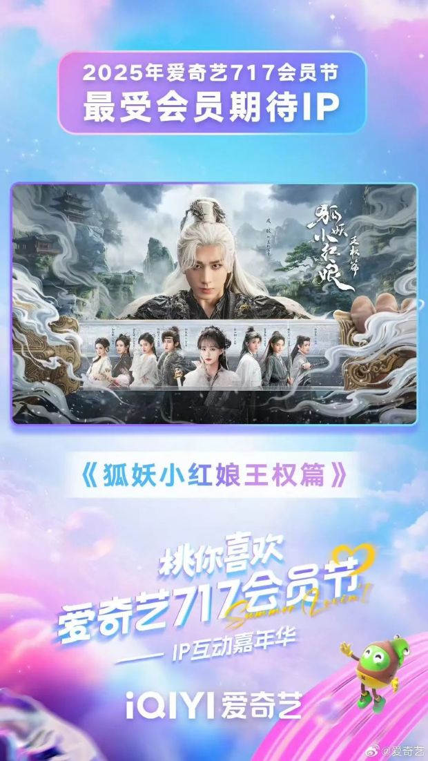 成毅主演的《狐妖小紅娘王權篇》最終拿下2025愛奇藝717會員節“最受會員期待IP”,今年的“愛奇藝尖叫之夜”將為其頒發榮譽。作品還沒上線,“王權富貴”的角色熱度就一路飆升,截至目前已成功突破3億。這離不開《蓮花樓》積累的大批忠實劇粉。