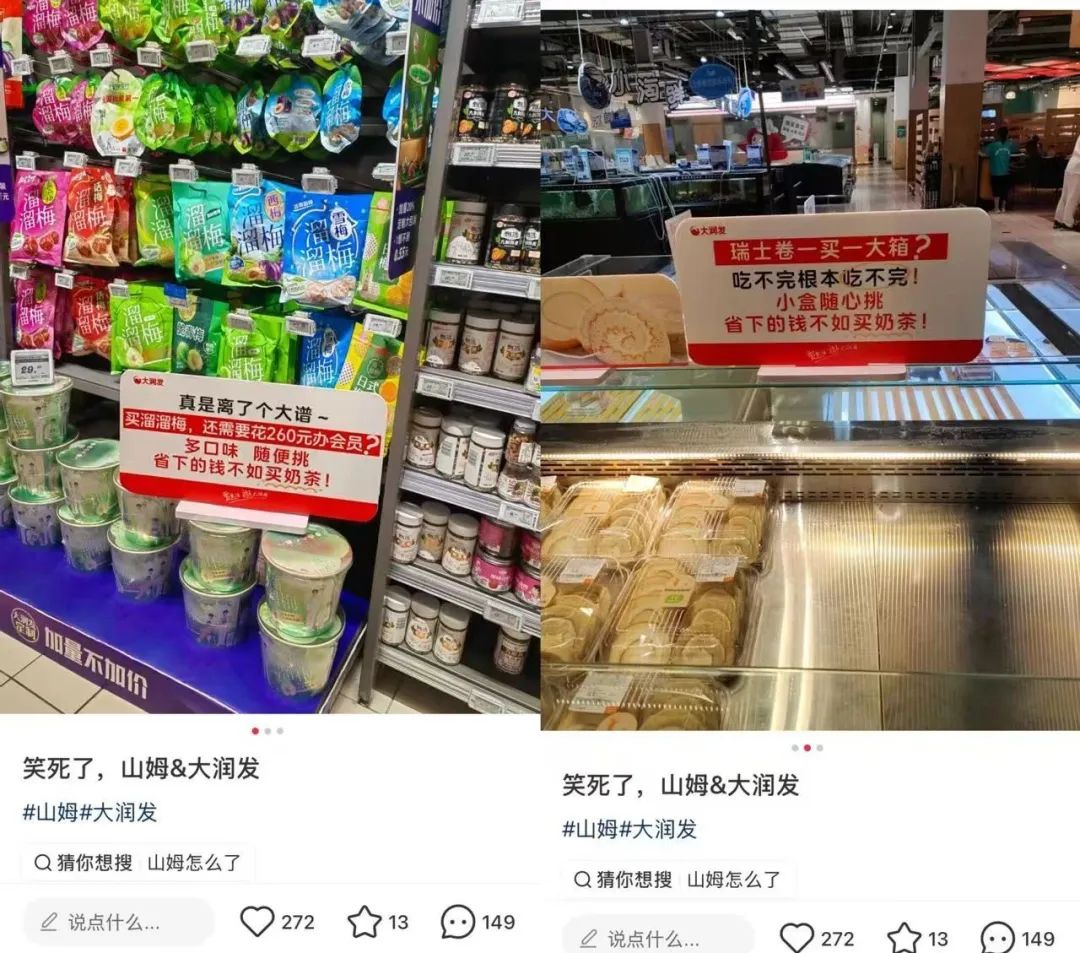 曾經的“超市之王”大潤發也沒有錯過流量。有消費者在逛大潤發的時候,溜溜梅、瑞士捲等山姆同款上有了新的商品標籤:“真是離了個大譜,買溜溜梅,還需要花260元辦會員?”