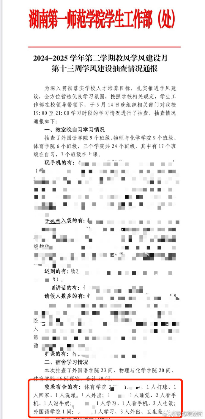 據相關圖片,一張名為“湖南第一師範學院學風建設抽查情況”的文件顯示,該校學生工作部組織多個部門,於今年5月14日對學校19點到21點的學習情況進行了抽查。抽查內容包括教室晚自習情況和宿舍學習情況。其中,關於宿舍學習情況,此次抽查涉及3個學院的59間宿舍。根據網傳的抽查情況通報,在該時間段內,(表現)較差的宿舍分別有1人打球、1人回家、1人洗澡和1人外出;另一間宿舍有1人在睡覺,還有1人在泡牛奶。通報末尾加蓋有湖南第一師範學院學生工作部的印章,日期顯示為2025年5月15日。