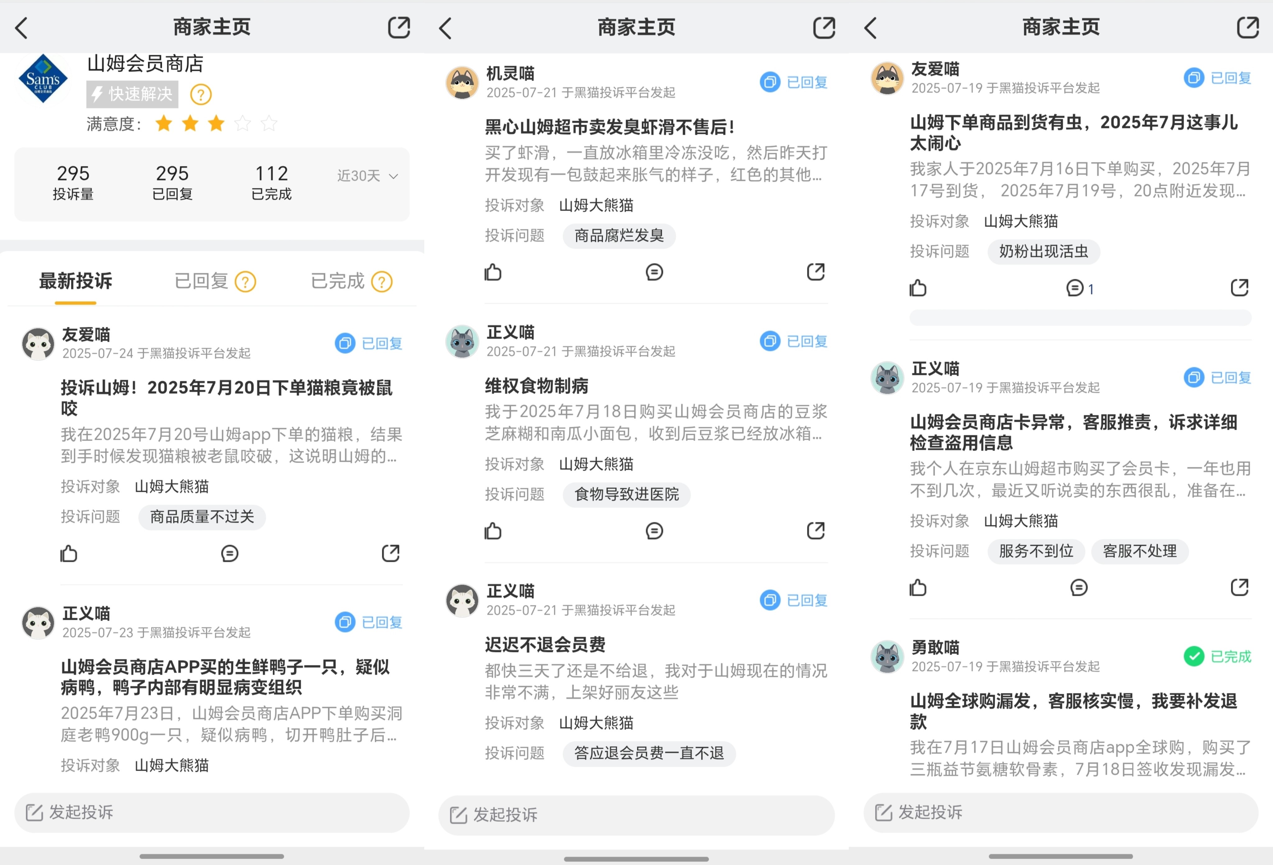 在過去一年,尤為明顯。從去年開始,陸續有消費者反映食品安全問題,比如深圳前海店牛奶包裝附着蟲卵、南京店果汁漂浮異物、常州店鮮肉月餅吃出牙齒等事件。據黑貓投訴平台數據顯示,山姆在2024年的相關投訴量同比暴漲了65%。