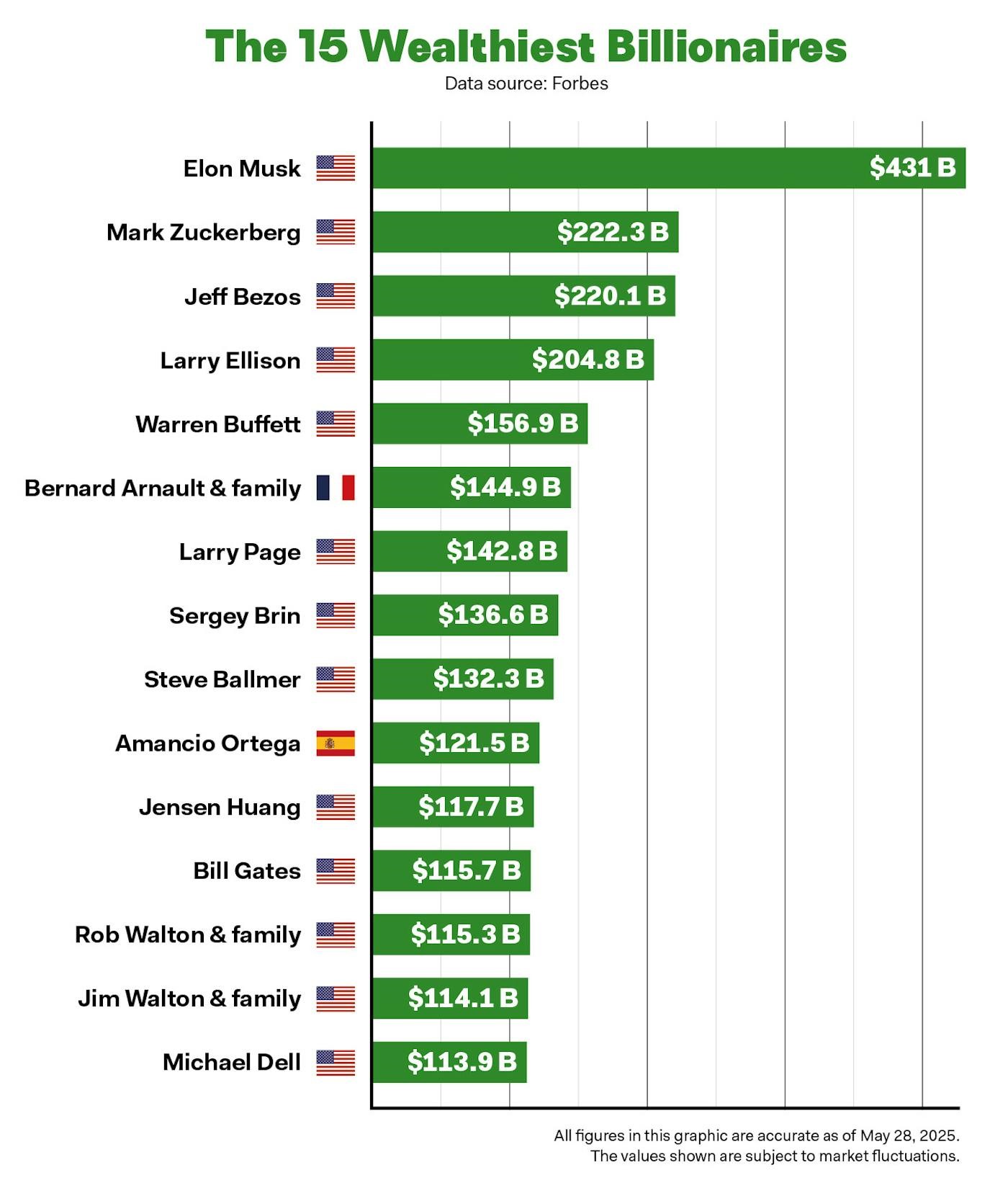 美國15大富豪。前三名為埃隆·馬斯克(淨資產4310億美元)、馬克·扎克伯格(淨資產2223億美元)、傑夫·貝佐斯(淨資產2201億美元)。數據截至2025年5月28日。