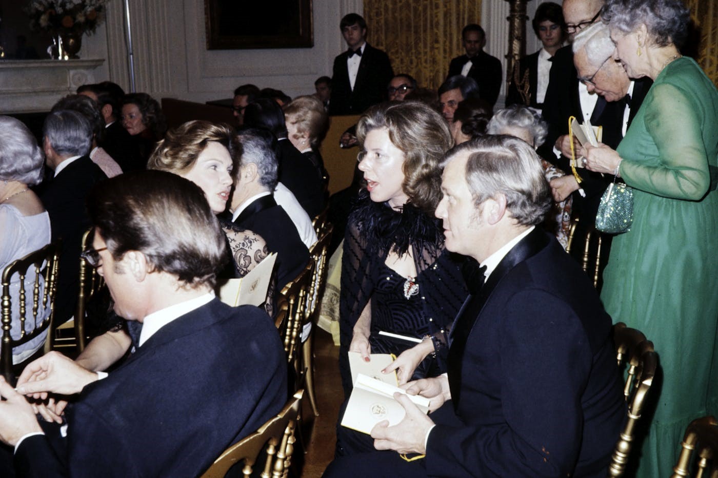1975年,理查德·梅隆·斯凱夫(右)在福特總統招待巴基斯坦總理布托(Zulfikar Ali Bhutto)白宮宴會上。GUY DE LORT/PENSKE MEDIA/GETTY
