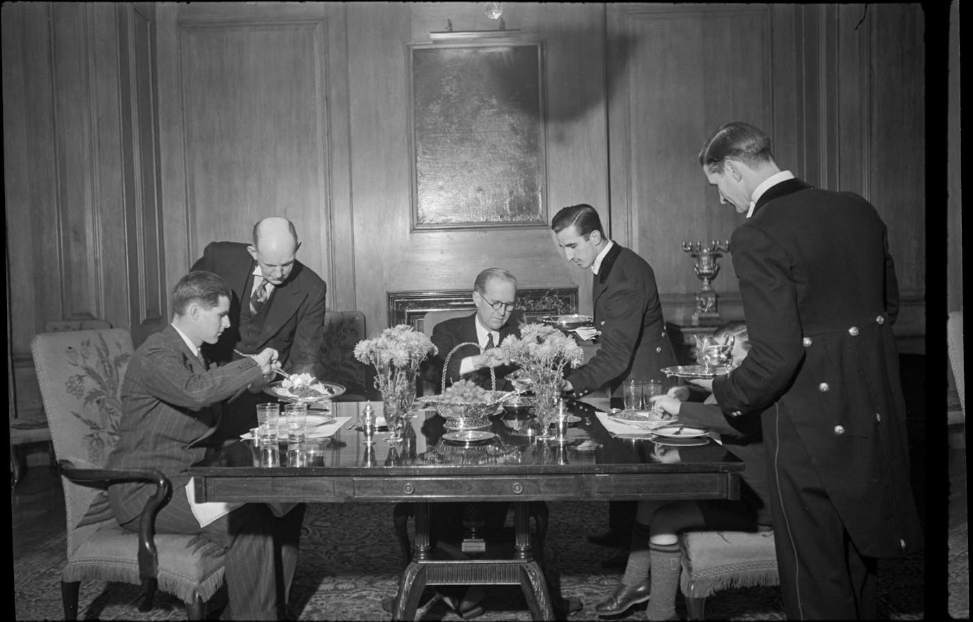 擔任駐英國大使期間的約瑟夫·肯尼迪在就餐,坐在畫面右側侍者身旁的是其子愛德華·肯尼迪。圖源:JOHN F. KENNEDY LIBRARY FOUNDATION. KENNEDY FAMILY COLLECTION. JOHN F. KENNEDY PRESIDENTIAL LIBRARY AND MUSEUM, BOSTON