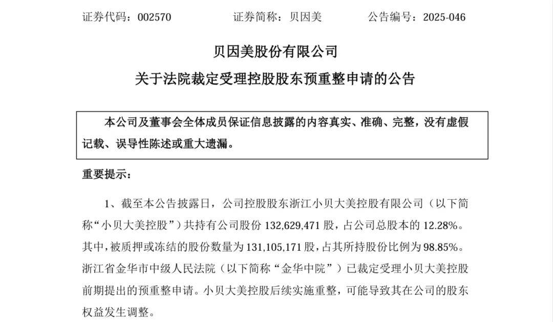 7月18日,貝因美宣佈其股東小貝大美控股向金華市中級人民法院提出的預重整申請尚未被正式受理,小貝大美控股後續實施重整程序,可能導致其在公司的股東權益發生調整。
