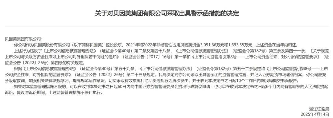今年4月,證監局出具警示函,稱控股股東2021年和2022年分別佔用公司資金3,091.66萬元和1,693.55萬元,存在非經營性佔用資金的情況(文件顯示,資金已歸還)。