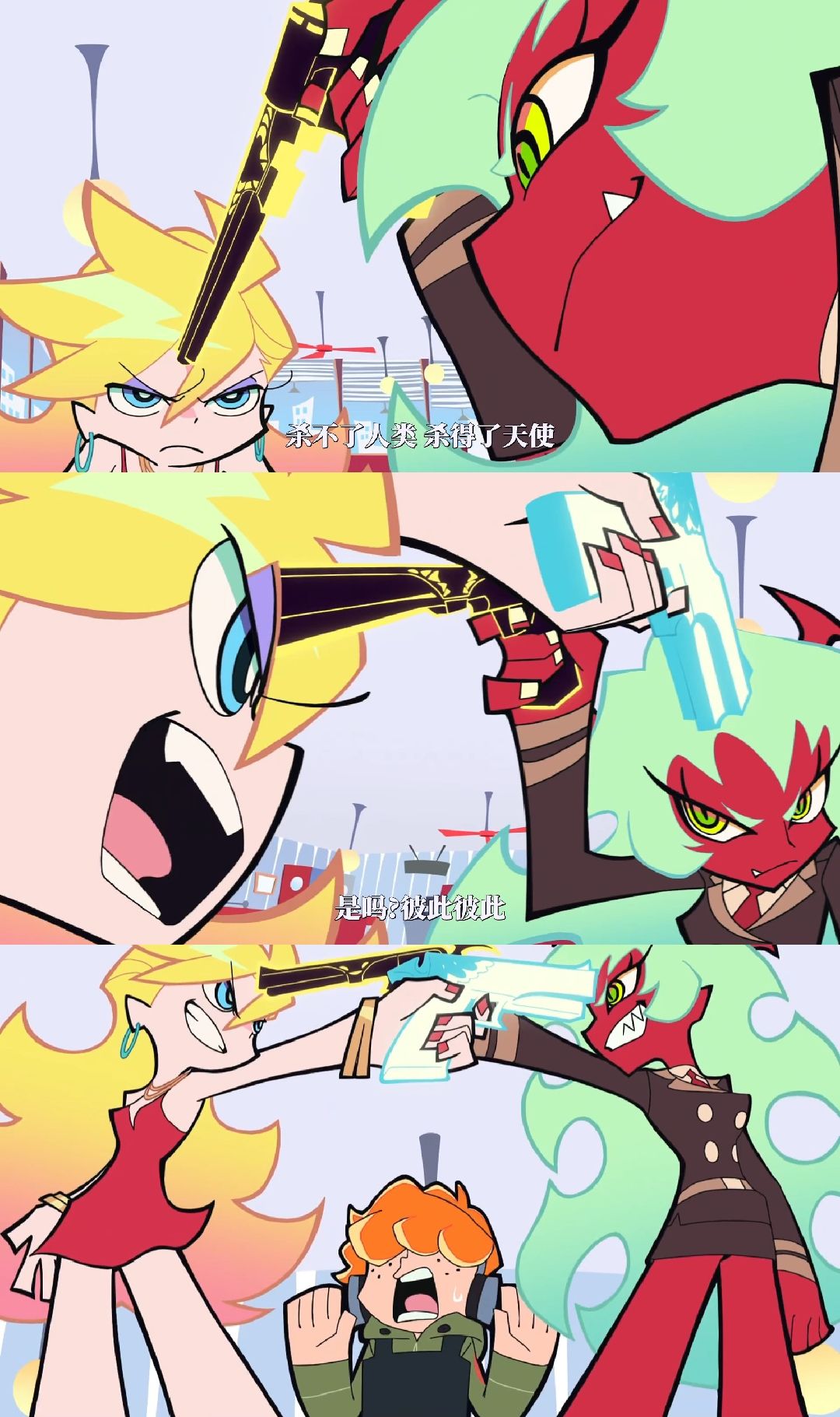 回到《吊帶襪天使》這部作品本身,讓我們把時間回到GAINAX時期,《天元突破》原班人馬在今石洋之的核心團隊帶領下,投入到《吊帶襪天使》的製作中,作品講述了……你不需要知道作品的背景與設定,只需要知道這部作品裏夾雜了大量私貨的同時能讓觀眾爽看就完事了,動畫創新的使用以美漫畫風為主,三種畫風夾雜其中卻不顯混亂反而相輔相成,被網友們戲稱為“美漫日漫奧特曼的結合”。