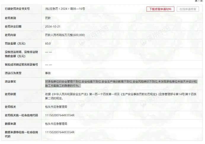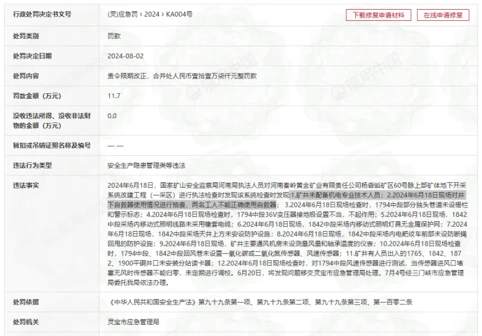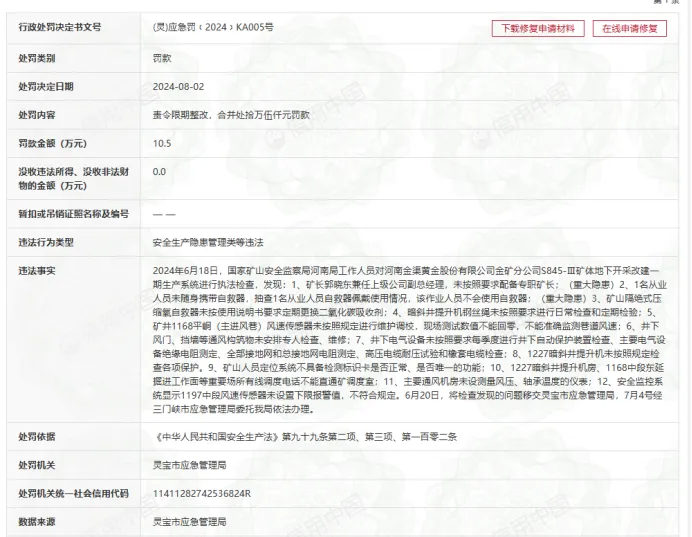 值得注意的是,就是內蒙古包頭鑫達黃金礦業有限責任公司這家子公司,在去年4月份出現施工人員墜亡事故後,還因為存在“安全設備的設計、製造、安裝、使用、檢測、維修、改造和報廢,不符合國家標準或者行業標準; 未對安全設備進行經常性維護、保養; 未採取措施消除事故隱患”、“使用應當淘汰的危及生產安全的工藝、設備; 2.礦山企業領導未按照規定帶班下井; 3.安全設備的安裝、使用、檢測、改造和報廢不符合國家標準或者行業標準; 4.未採取措施消除事故隱患”等原因,在去年6月份被包頭市應急管理部門兩度處罰。(處罰文書號:包應急罰﹝2024﹞執1041號、包應急罰﹝2024﹞執1042號)。