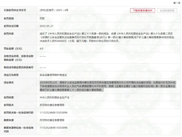 處罰決定顯示:“2025年4月22日,國家礦山安全監察局內蒙古局及蘇尼特右旗應急管理局對你公司開展執法檢查時發現,白音哈爾礦區四中段下斜坡道掘進地點現場作業人員的氣體便攜報警儀未開機使用,根據《金屬非金屬礦山重大隱患判定標準》第一部分金屬非金屬地下礦山重大事故隱患第二十一條判定為重大事故隱患。”