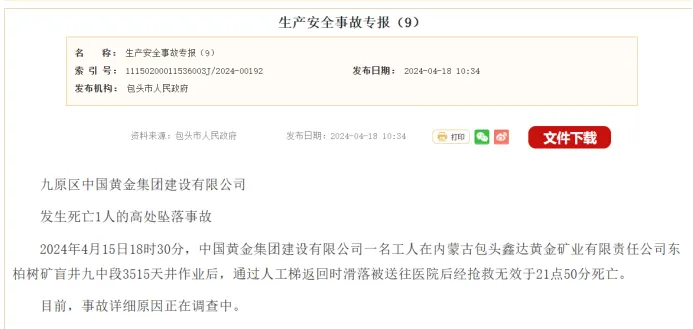 這背後,也是一起安全事故和一條人命。根據包頭市政府當時的通報和後續對中國黃金集團建設有限公司的處罰來看,相關責任單位違反安全生產管理制度,僱傭並安排患有高血壓的工人進行高處作業,施工時未設置人行梯子間和溜渣間,安全檢查不到位等諸多隱患導致人員墜亡。