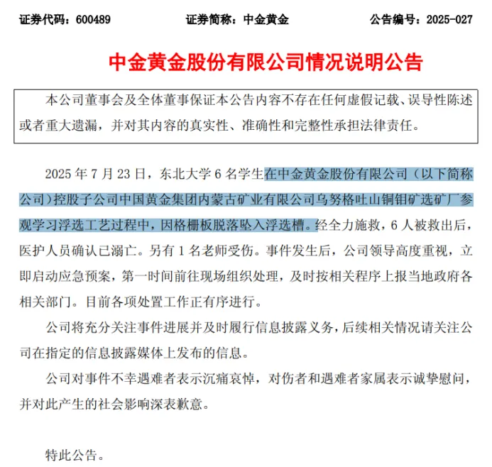這次,中國黃金集團旗下的上市公司中金黃金,因為6名東北大學學生在其控股子公司中國黃金集團內蒙古礦業有限公司烏努格吐山銅鉬礦選礦廠參觀學習浮選工藝過程中,因格柵板脱落墜入浮選槽,後經搶救無效身亡,並有一名教師受傷。