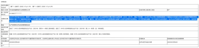 處罰信息顯示:“2025年1月9日至1月10日,國家礦山安全監察局河北局對河北峪耳崖黃金礦業有限責任公司地下開採進行了督導檢查,依據國家礦山安全監察非煤礦山安全監察移送書冀非煤安全監察四移〔2025〕2001號 ,提出下列問題:1.五分礦285m中段31線穿脈巷掘進工作面接近白花崗岩與灰質白雲岩接觸帶裂隙發育區,掘進前只施工了2個超前探放水鑽孔。2.河北冀東建設工程有限公司為採掘工程承包單位,從事井下檢查井巷和採場頂、幫的穩定性,撬浮石,進行支護作業的人員未取得金屬非金屬礦山支柱作業特種作業資格證。3.礦井受地表水威脅,ZK1306鑽孔為未封閉鑽孔,在425m水平該鑽孔位於新Ⅸ採場內,該採場作業前未對該鑽孔採取有效治理措施。”