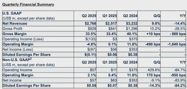 從核心業績表現來看,意法半導體第二季度的成績單並不理想。營業虧損約 1.33 億美元,而 LSEG 調查彙編的華爾街分析師平均預期為營業利潤 5620 萬美元,業績明顯不及市場預想。