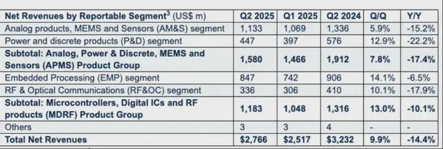 從目前公佈的財報來看,2025年二季度意法半導體、德州儀器以及恩智浦均在MCU以及模擬芯片相關業務部門遭遇整體業績下滑。三大MCU巨頭財報均顯示:車規級MCU需求並未如預期強勁反彈,行業仍處於庫存出清與宏觀不確定的雙重壓力期。