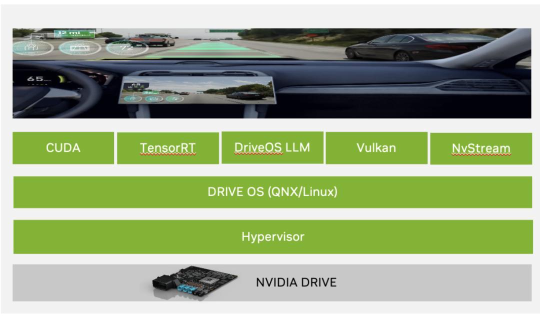 DriveOS 是英偉達提供的軟件板級支持包,包括英偉達自研的Type-1 虛擬機,虛擬機之上不同的操作系統(Linux或者QNX),操作系統上的豐富的SDK。這些SDK包括大家熟悉的CUDA,TensorRT,Vulkan,還有特意為支持大語言模型的軟件開發包DriveOS LLM SDK。這些SDK可以使開發者更容易的訪問 SoC 中的各種硬件加速引擎,快速的部署應用在英偉達的平台。