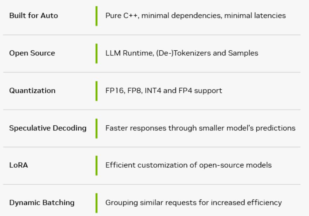 DriveOS LLM SDK 是英偉達為嵌入式端特別推出的大語言模型軟件開發包,包含多個專為高效 LLM 推理而設計的關鍵組件。這些組件可確保在汽車平台上高效部署 LLM,包括: