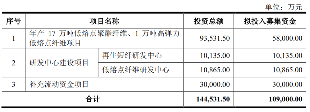 據天富龍招股書申報稿,公司擬募集109,000.00萬元分別用於“年產17萬噸低熔點聚酯纖維、1萬噸高彈力低熔點纖維項目”“研發中心建設項目”以及補充流動資金。
