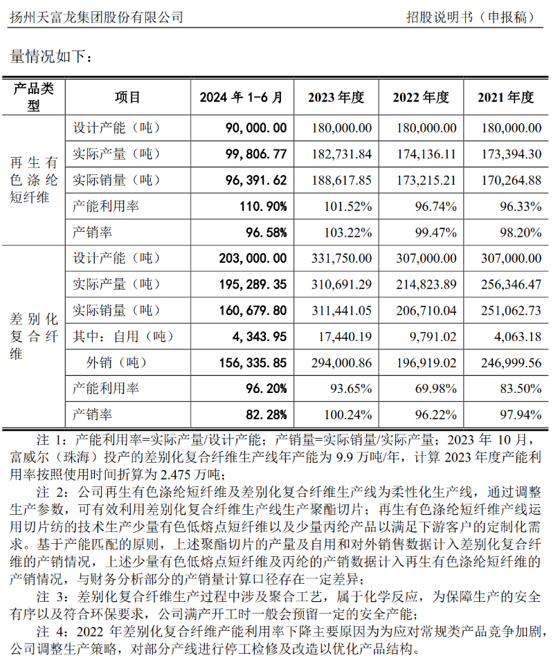 但進一步查閲公司招股書不難發現,公司兩份財報,對同一年產銷率等關鍵經營數據披露不一致,對此,天富龍 2023年06月09日提交申報版招股書後,2024年11月02日再次更新的申報版招股書中特別強調:基於產能匹配的原則,上述聚酯切片的產量及自用和對外銷售數據計入差別化複合纖維的產銷情況,上述少量有色低熔點短纖維及丙綸的產銷數據計入再生有色滌綸短纖維的產銷情況,與財務分析部分的產銷量計算口徑存在一定差異。