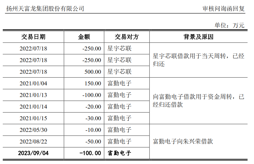 天富龍表示,2020年及報告期內,公司實際控制人陳慧、銷售部長張立忠與客户、供應商的關聯方存在資金拆借,相關資金均為個人資金往來,不涉及天富龍的業務或資金,不涉及天富龍財務不規範的情形,不存在違規情況。