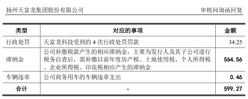 根據問詢函回覆函,天富龍滯納金是因為公司補繳税款產生的相應滯納金,主要為天富龍及其子公司進行税務自查後,需補繳以前年度房產税、土地使用税、個人所得税、企業所得税、印花税相應產生的滯納金。