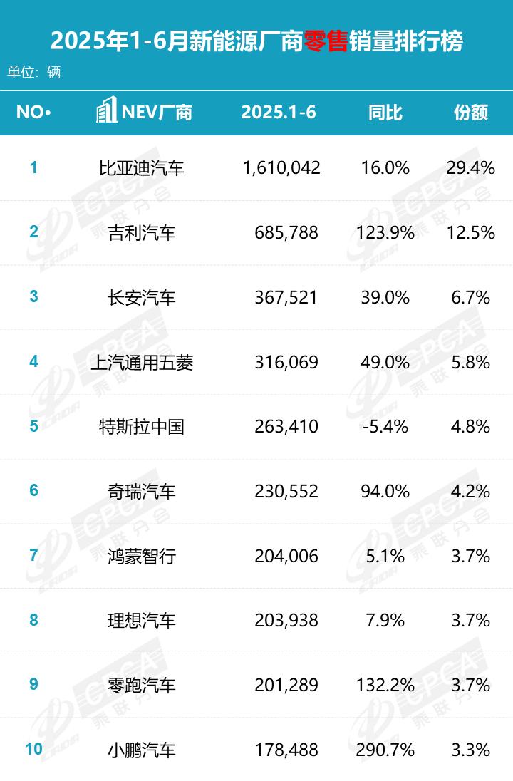 今年前6個月,TOP 5新能源汽車廠商銷量佔整體市場份額的59.2%,TOP 10則佔比77.8%。