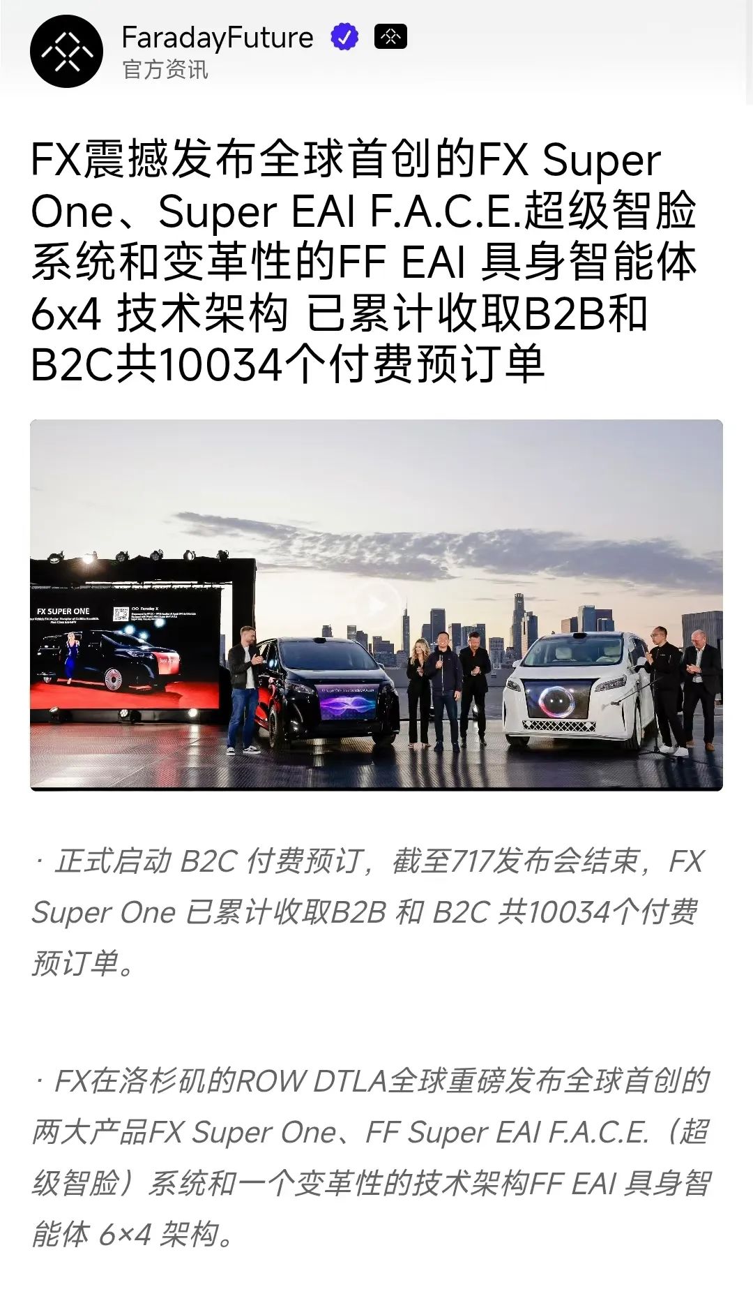 賈躍亭宣佈 FF FX 首款純電動中大型 MPV 車型 Super One 首發亮相併開啓預訂,前臉自帶顯示屏