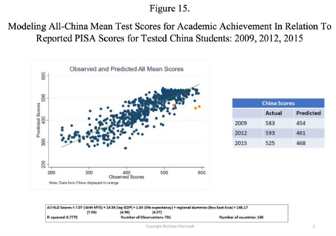 4. 例如,斯坦福REAP項目2015年對陝西、貴州、江西三省農村小學測試,在PIRLS四年級母語閲讀測試(對中國學生用中文),成績是44個國家倒數第一。加進農村數據後,就能大幅拉低分數。還有考慮經濟因素、應試教育因素,加入被放棄的低分羣體,種種模型調整後,就得出了想要的結論。