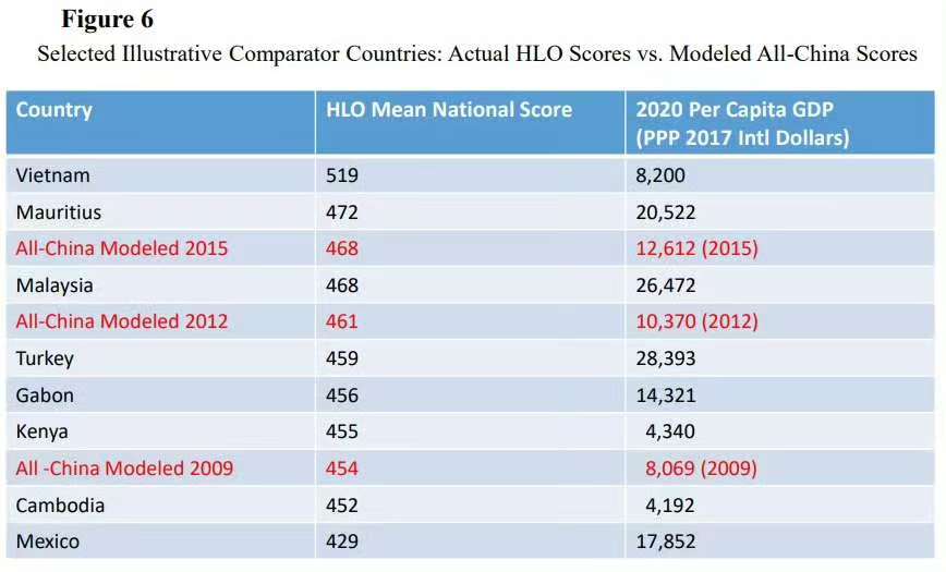 由於中國選派了經濟發達地區的學校,不能代表全國情況,根據各種因素調整以後,中國實際PISA分數大幅下降。2012年和2009年,每門平均分下降130分。2015年有廣東更接近真實,每門下降約60分。調整後就顯得正常了。如圖三是世界銀行對分數的調整結果,中國低於越南,和土耳其、墨西哥接近,符合PPP人均GDP的分佈類型。不如東亞其它人均GDP高的地區。結論是,中國的“知識資本”並沒有PISA測試顯示得那麼嚇人,還是可以理解的“中等收入”發展中國家檔次,鼓勵美國政策制定者不要害怕。