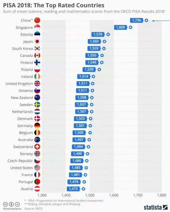 1. 中學生PISA(國際學生評估項目)測試由經合組織OECD2000年發起,每三年一次。中國參加四次,三次第1,一次第10。2009 年派上海學生,閲讀、數學、科學三項均列榜首 。2012 年還是上海,都是第一。2015 年由北京、上海、江蘇、廣東四省代表,數學6 位,科學第10,閲讀第27,總分排名第 10。2018年改為北京、上海、江蘇、浙江,三項又都回到第一。