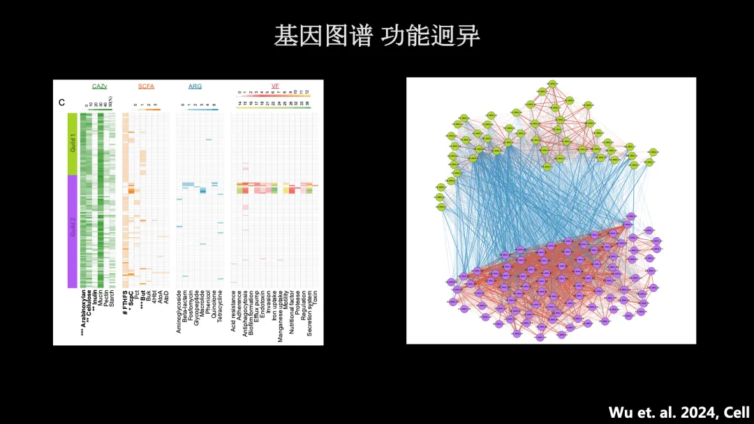 再來看一看,第二個功能羣裏邊的基因組,我們就會發現裏邊很多基因組,帶着幾乎所有已知的抗藥性基因,也帶着幾乎所有已知的,能夠引起疾病的獨立因子基因,説明第二個功能羣裏面有很多菌,是我們所説的條件致病菌。當然了第二個功能區升高的時候,它們產生的一些有毒有害的物質,比如説內毒素、還有吲哚、硫化氫,就有可能造成我們健康的危害。