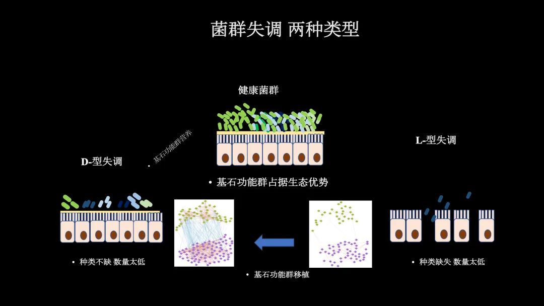 那這樣的病人怎麼辦呢?我們可以從一個健康的供體,最好的是母系親屬的供體,因為基石功能羣主要是媽媽傳給孩子的,把她的基石功能羣,富集起來,然後定向轉移給這個病人。再給這個病人,在他的膳食結構裏,增加新進來的基石功能羣所需要的營養,讓它獲得生態優勢地位,這樣我們就可以給一個病人,重構一個以基石功能羣佔優勢的,健康的菌羣。在這樣的一個菌羣的支持下,他以前的症狀可能緩解,炎症可能消退,生活質量可能會得到改善。