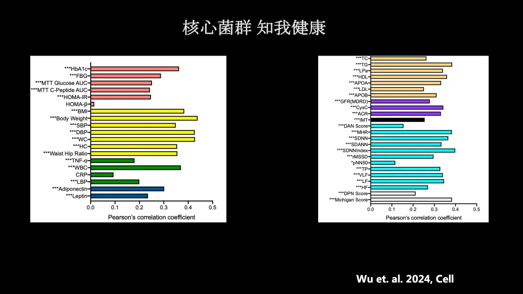 那麼我們用我們的核心菌羣裏邊的,這些基因組做變量,可以訓練機器學習模型,實現了對43個糖尿病和併發症的臨牀指標,其中的42個進行預測。也就是説你只要讓我測量出來,這一百多個菌的數量,我就可以用這些菌的數量,來預報這個病人的糖化血紅蛋白,應該有多高,這個預報的準確度還是蠻高的。