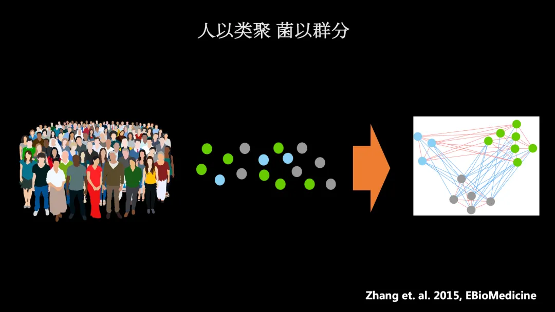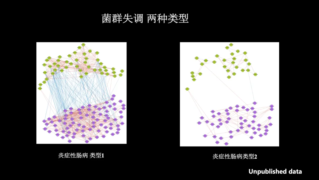 有了這樣的一個分析體系以後,我們就開始思考,到底怎麼樣才能夠把核心菌羣找到。我們就看到,當飲食發生變化,疾病開始發生發展的時候,我們知道腸道菌羣就會發生變化,就受到擾動。在這種擾動下,我們就想知道誰和誰是鐵哥們,怎麼折騰它們的關係都不會破裂,誰和誰是死對頭,怎麼折騰它們都是要競爭的。
