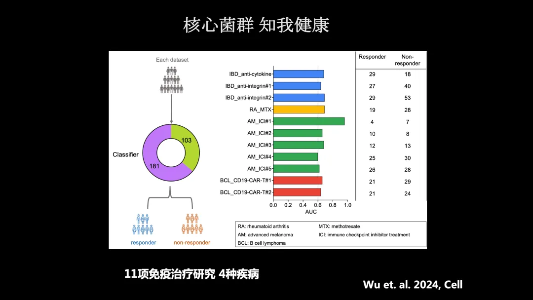 現在免疫治療,特別是癌症的免疫治療很熱,也有大量的報道説,病人在治療前的菌羣結構狀態,會影響這個病人對免疫治療到底會不會有反應。我們用我們那個核心菌羣裏邊的細菌,把別人已經發表的,4種疾病的,11項免疫治療的數據拿來,我們可以看到在病人治療前的數據裏邊,把我們這些核心菌的數量查出來之後,我們可以預報每一個病人,對這個免疫治療會不會有反應,預報的準確率也是相當不錯的。