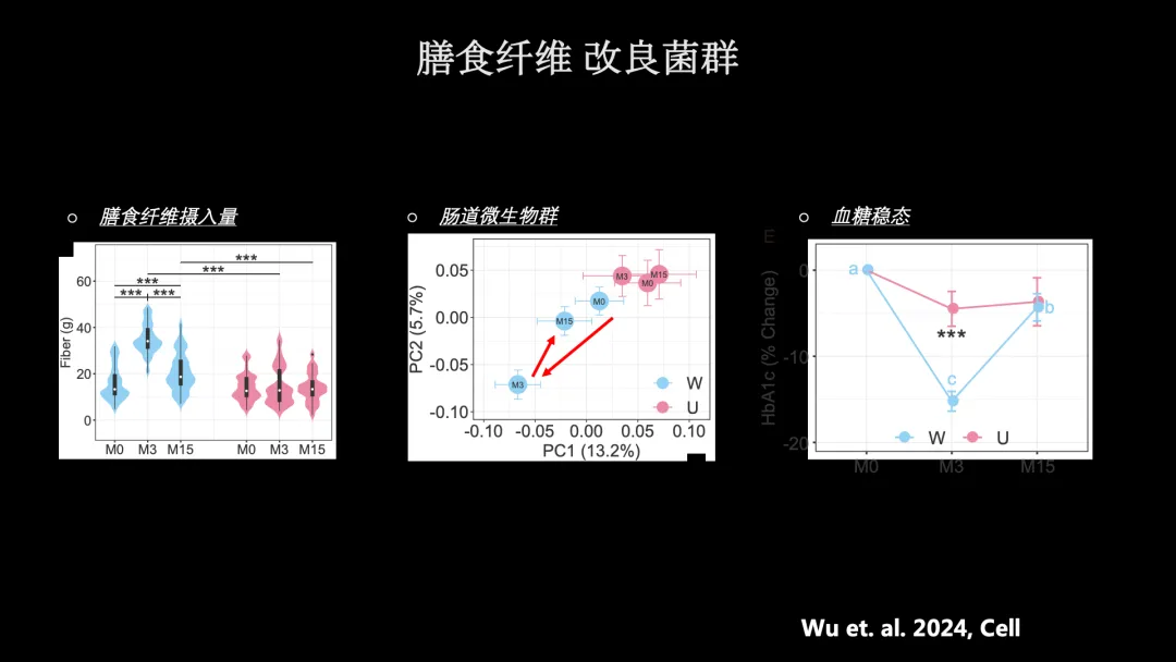 所以在接下來的十幾年裏,我們組織了多項的臨牀實驗,比如説我們在糖尿病人裏面,讓他吃WTP飲食三個月,我們就發現糖化血紅蛋白下降,腸道菌羣也變成了另外一種樣子。如果我們飲食干預停止了,過了一年以後,再讓這些病人回來,結果就發現他們的菌羣又回到了,和治療前一樣的狀態,糖化血紅蛋白也反彈回來了。那麼在這樣一個高膳食纖維飲食,干預和掣肘的情況下,腸道菌羣發生了劇烈的變化。