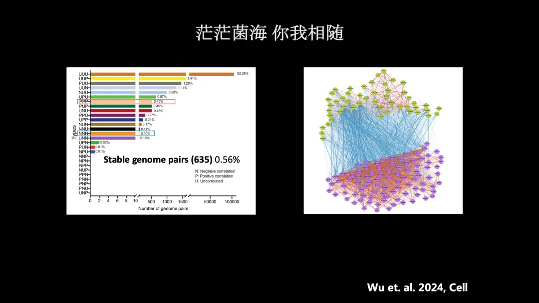 有了這樣的一個體系以後,第一、我們對細菌的識別,可以精確到接近菌株的水平,就避免了把壞細菌和好細菌混在一起,進行分析的弊端。第二、只要有這個細菌的基因組序列,我就可以追蹤研究它,不管這個基因組,以前有沒有人研究過,是未知的還是已知的細菌,都沒有關係。第三、我們要把目光,聚焦在誰和誰是協作的,誰和誰是競爭的這件事情上,而不是直接上來就分析,每一個細菌的升高降低,是不是和我們的健康狀況的變化有相關性。