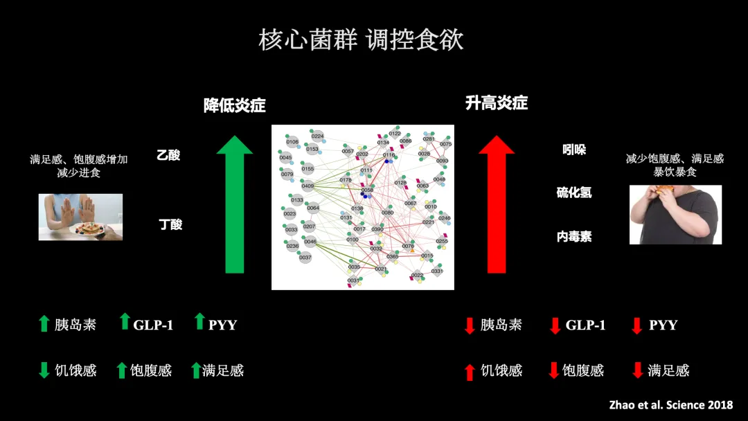 我們就把同一個病人,干預前的菌羣,和干預三個月以後變了的菌羣,移植到無菌小鼠裏邊。干預前的菌羣在無菌小鼠裏邊,是可以引起糖尿病的症狀的,比如説胰島素抵抗,還有空腹血糖升高,還有全身性的炎症,脂肪肝等等。而干預後的菌羣,不但不引起這些代謝的紊亂,甚至還可以改善代謝,更好的改善血糖。