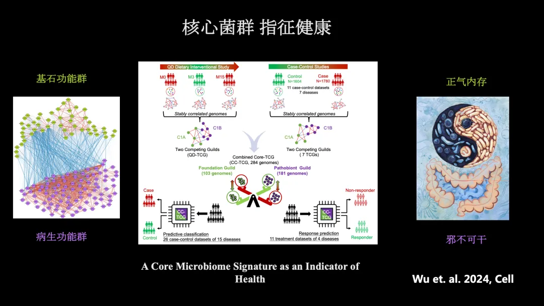 2024的11月14日,我們在國際著名的《細胞》雜誌,發表了一篇論文,論文的題目叫《一種能夠作為健康指徵的腸道菌羣的核心菌羣特徵》。我們就發現腸道里邊的細菌,有兩組細菌是構成非常穩定的兩個功能羣,這兩個功能羣像蹺蹺板一樣,你升我降來指徵和影響着我們的健康。其中一個功能羣叫做基石功能羣,它是一個有益的,對我們的健康有保護作用的菌羣。而另外一個菌羣,在特定的條件下,可能對我們的健康有危害。這兩個菌羣的你升我降,不但能夠指徵我們的健康,還可以解釋我們健康狀況發生變化的原因,當然也有可能成為,干預和維護我們健康的,一個特殊的新的靶點。