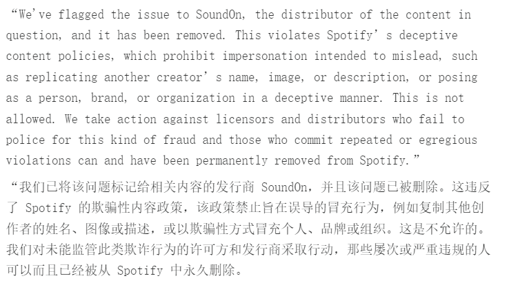隨着事件的持續發酵,在媒體揭露與輿論壓力的雙重推動下,Spotify終於將這些AI偽作從平台撤下,並在聲明中引用其“欺騙性內容政策”作為下架依據,同時向內容發行方 SoundOn 發出警告。