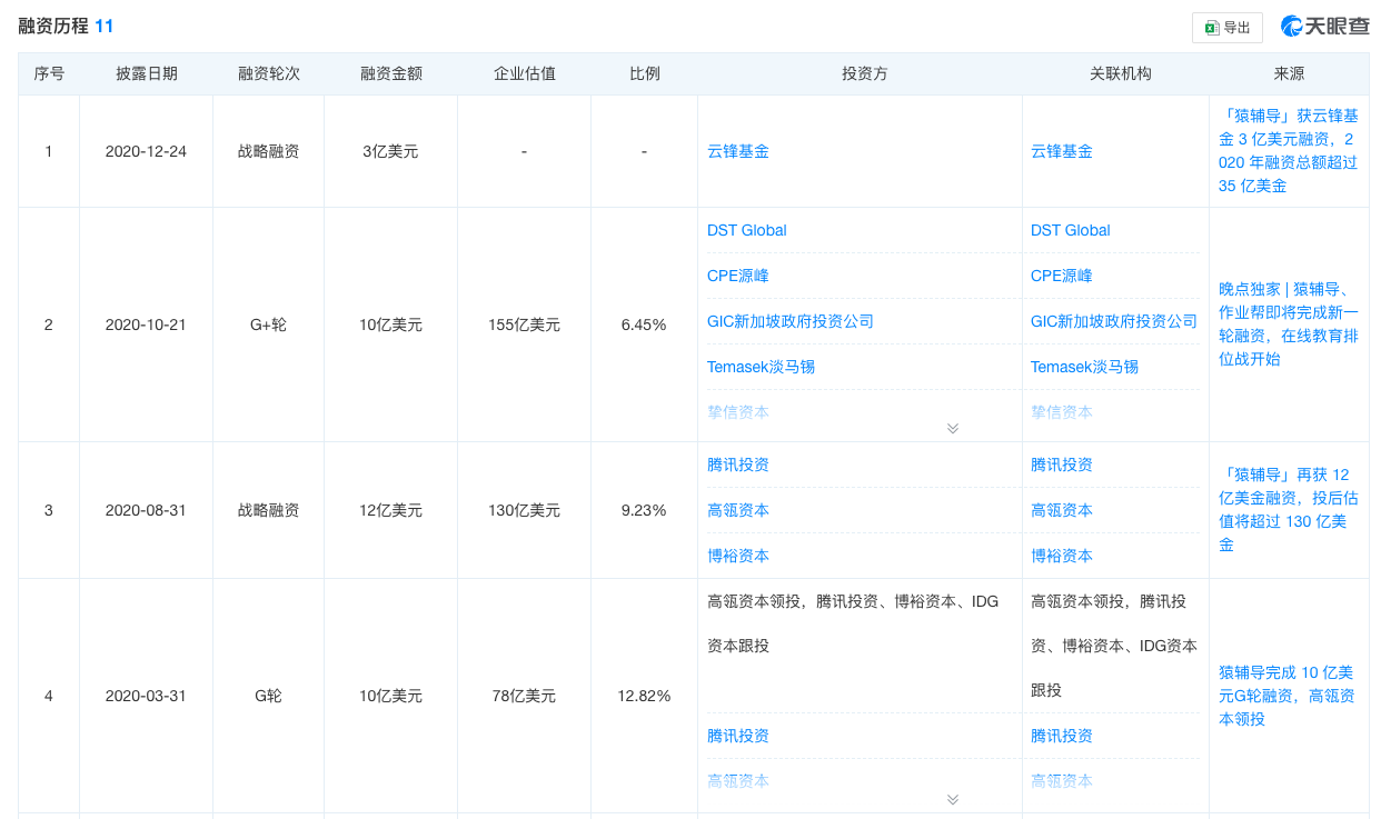 彼時,中小學課外輔導需求陡增,猿輔導成為了資本市場的寵兒。天眼查顯示,2013年-2020年,猿輔導共完成11輪融資,平均每年1.6次。2020年12月,猿輔導完成最後一輪融資,獲得雲鋒基金3億美元戰略投資,投後估值達170億美元,成為全球在線教育行業估值最高的獨角獸公司。當時,網上曾傳出猿輔導將於2020年底上市的消息,資本市場對其IPO前景充滿期待。