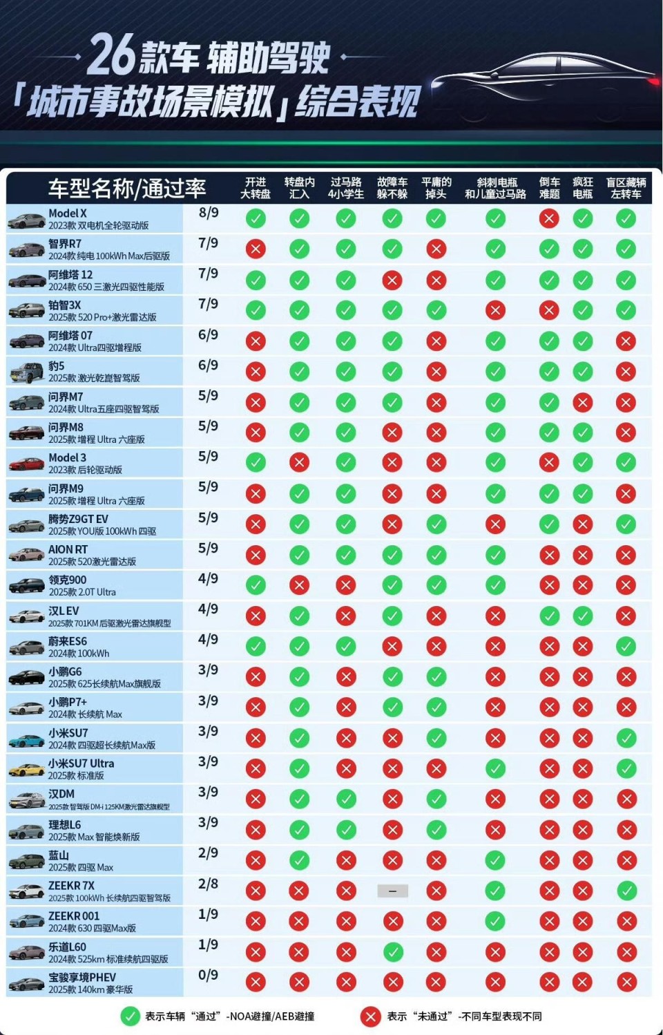 不過,這次測試也引發了一些爭議,測試的結果跟不少人預期的不一樣。那些耳熟能詳的搭載華為輔助駕駛的問界M9、M7、智界R7、小米SU7等表現都不算太理想(跟企業實際宣傳的落差太大)。