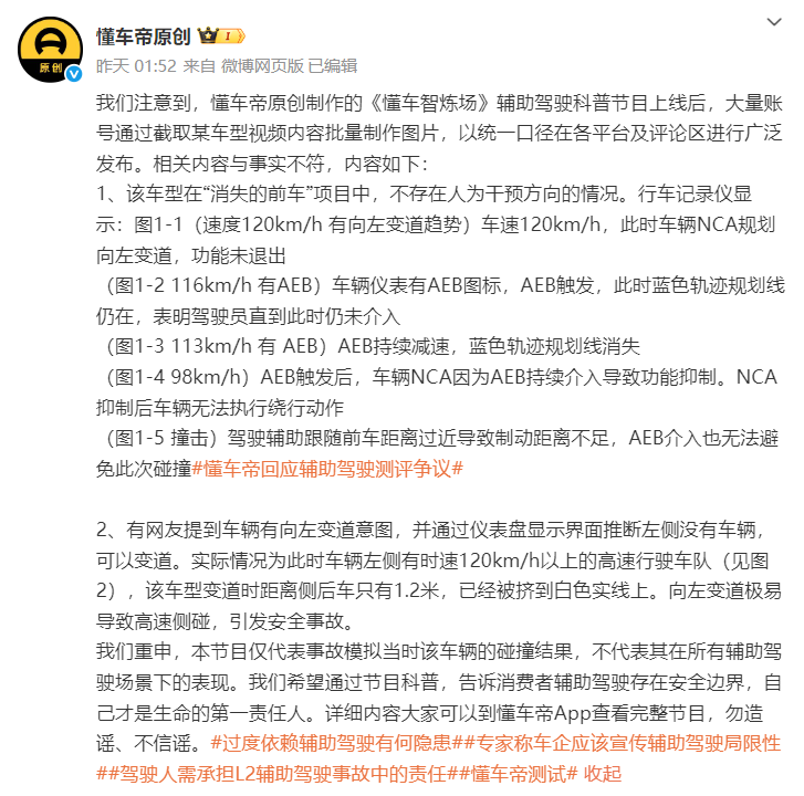 7月24日,懂車帝發文回應稱,懂車帝原創制作的《懂車智煉場》輔助駕駛節目上線後,大量賬號通過截取某車型視頻內容批量製作圖片,以統一口徑在各平台及評論區進行廣泛發佈,相關內容與事實不符。