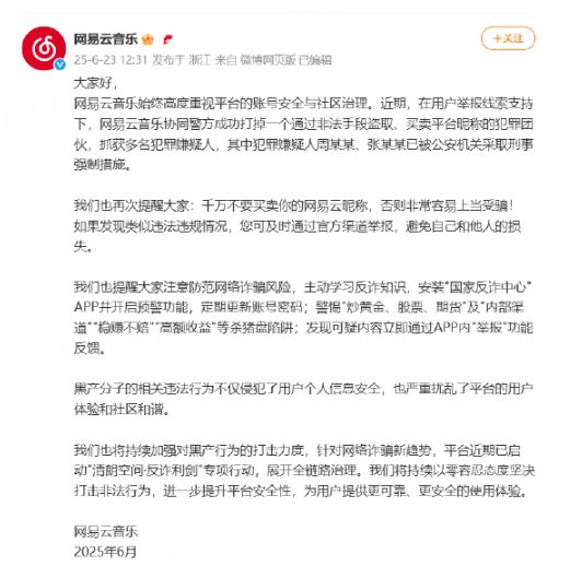 6月23日下午,網易雲音樂公佈最新黑產治理成果:在用户積極舉報線索支持下,平台協同警方成功破獲一起盜取、倒賣平台暱稱的刑事案件,抓獲多名犯罪嫌疑人,其中周某某、張某某被公安機關採取刑事強制措施。